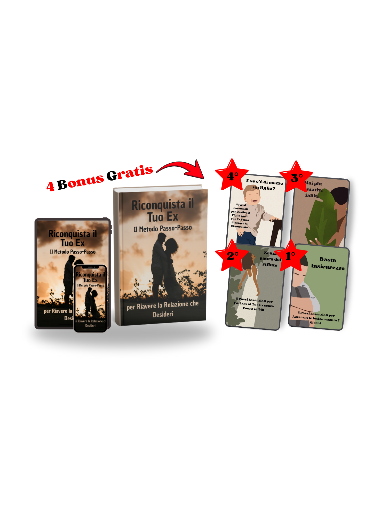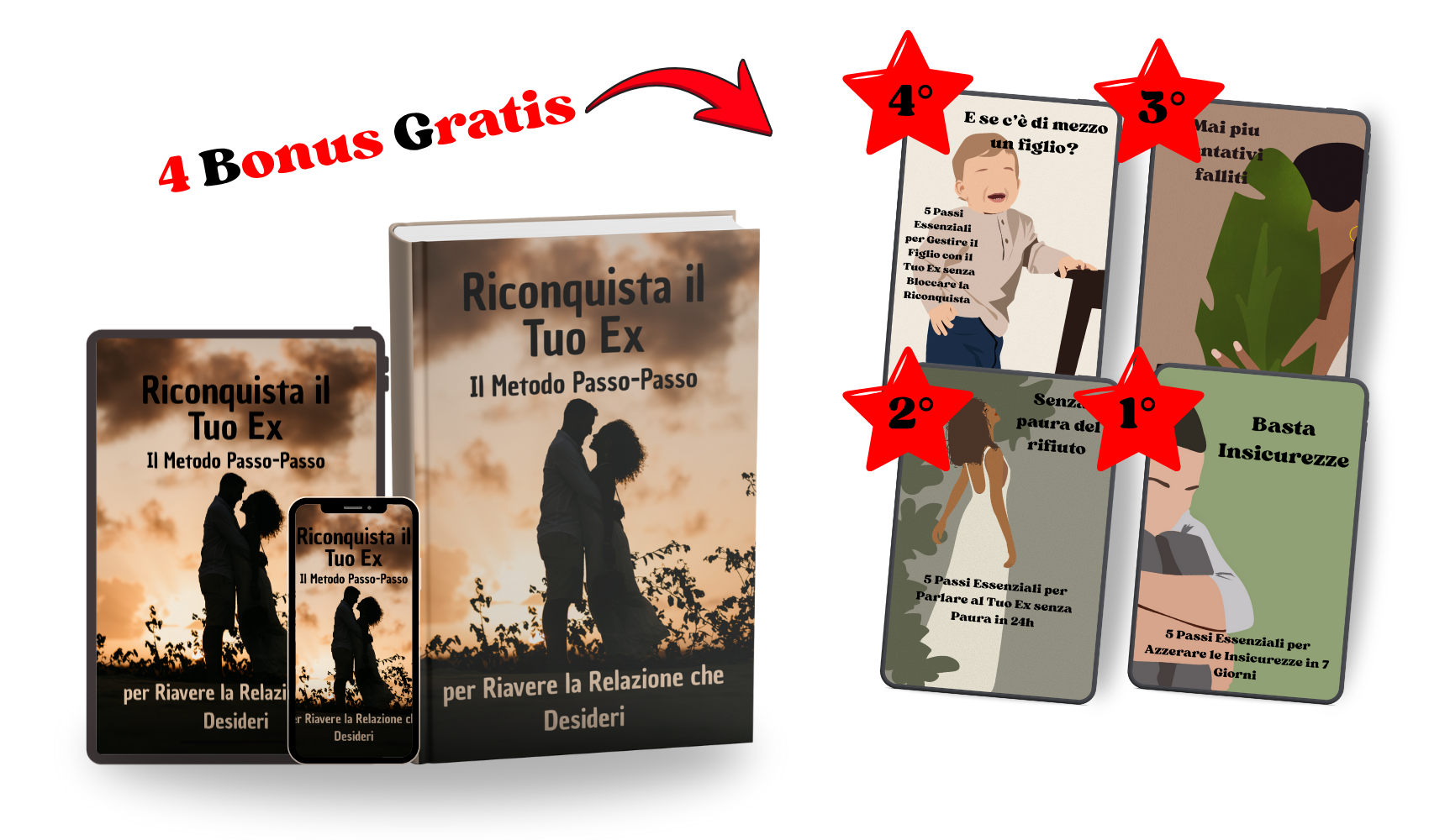 Per meno del costo di una cena fuori o di una borsa fast fashion, puoi avere tra le mani la guida completa + 4 bonus esclusivi che ti mostreranno come tornare al cuore del tuo ex senza più paure o tentativi inutili.